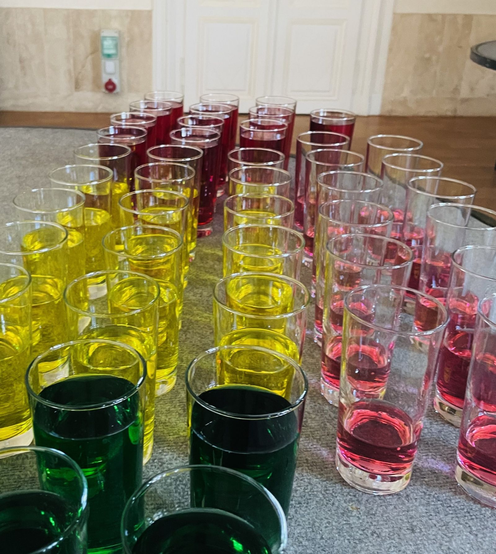 A rendezvényre szervezett vacsora előtt vagy után hoszteszeink egységes megjelenéssel várják a vendégeket. Minden vendég elé elhelyeznek egy-egy előre felhangolt poharat, színezett folyadékkal. Ezzel egy időben a kivetítőn megjelenő animáción a dal színezett kottája látható.